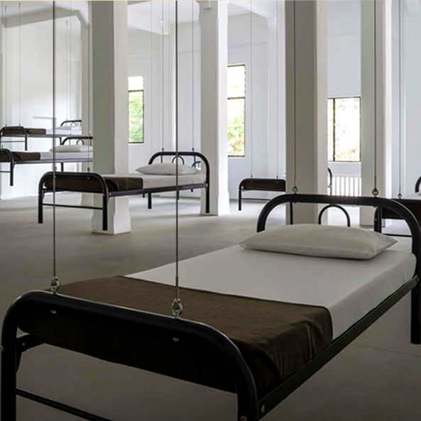 This is a site-specific work made in response to the location, a former army barracks that housed Singapore’s army recruits. Army beds swing gently in the air, some rising higher than others. Viewers are allowed to sit or lie down on the beds, the gentle swaying motion experienced, alluding to...