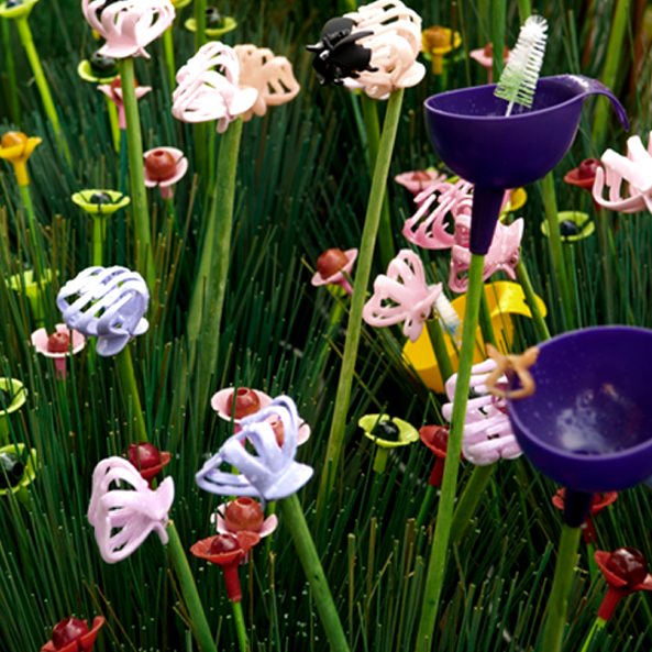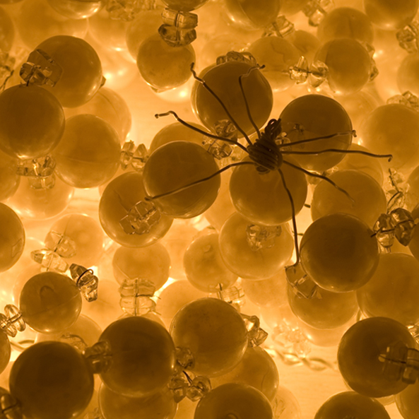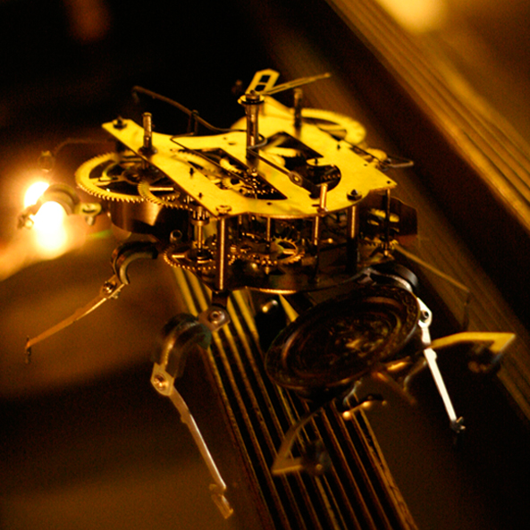 This site-specific installation recreates the environment and bug-like denizens of a tree’s trunk, through the use of found objects. Antique wooden clocks and their interior working mechanisms are playfully transformed into spiders and homes for butterflies. The interior surfaces of the clock-cases are covered with wallpaper, bringing to mind the...